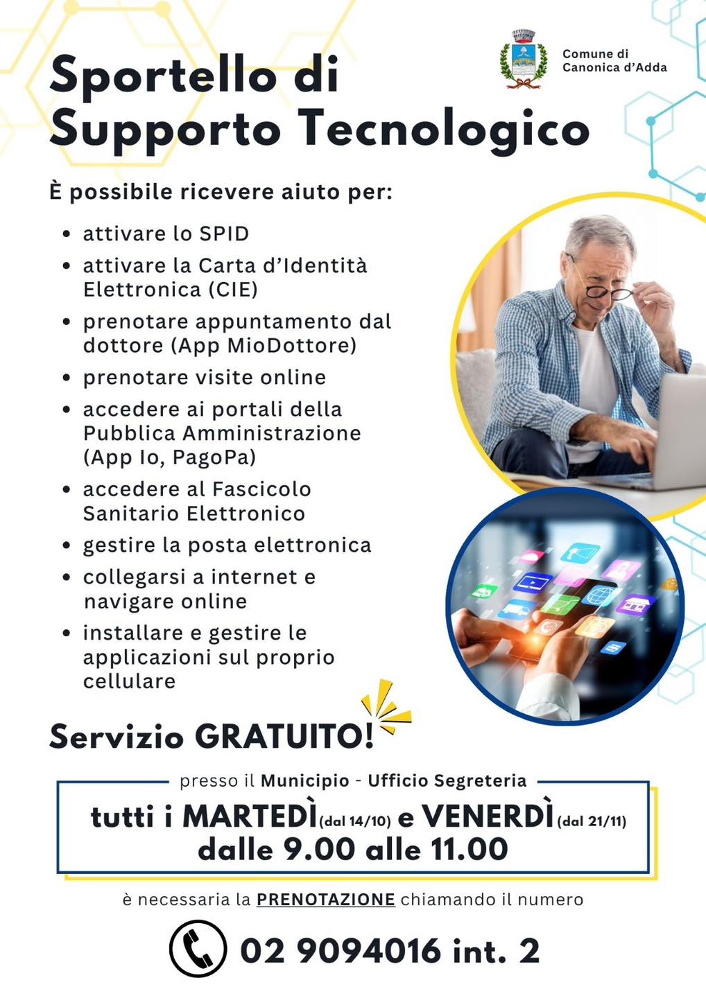 Il Comune di Canonica d'Adda attiva lo Sportello di Supporto Tecnologico, un servizio gratuito per aiutarti a usare strumenti digitali come SPID, CIE, app per prenotare visite o accedere ai portali della Pubblica Amministrazione.